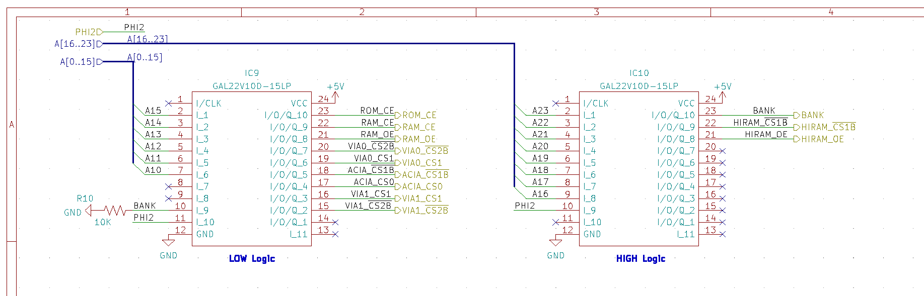 Since I designed the logic to be two matching chips, it would be easy to get them confused. And they’re skinny DIPs, so a big label just doesn’t fit. It’s annoying, but I can work with it. I think I could get the Hi-RAM into a 16V8 for now, but I want to leave the space for expansion as the board grows.